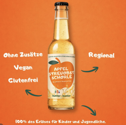 Gemeinsam mit der kunter+bunter Kinderstiftung haben wir eine Streuobst-Schorle entwickelt: 50 % Apfelsaft, 5 % Quittensaft, Wasser und Kohlensäure – aus regionalem Streuobst, ohne Zusätze. Der gesamte Erlös fließt in die Förderung von Kindern und Jugendlichen. Am Fest gibt es die Schorle bei uns am Tresen. Die Stiftung ist mit eigenem Stand vor Ort.